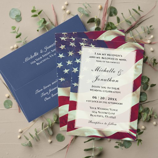 Wedding envelope with patriotic USA Flag depicts the red, white and blue American flag stars and stripes. It features return address and Christian inspirational quote, "Two lives united in friendship, Two friends united in love, One love united in Christ."