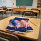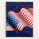 A bold spiral notebook featuring a wavy American flag with festive red, white, and blue confetti. Perfect for school, journaling, or patriotic gifts.