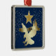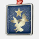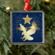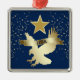 Here's a pretty patriotic Christmas ornament that is unique! It features a gold star above a shiny silhouette gold eagle about to land. Across the eagle's wings is a gold banner that says USA. Glittery gold confetti decorates the left and right sides, and everything is placed on a dark blue background.