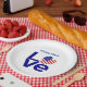 Personalised party paper plates have a place for a name for yourself or a special guest of honour. The design shows the word LOVE in blue letters with a heart shaped flag of the United States of America for the O in love. For special occasions, like 4th of July or Independence Day. Great for a housewarming party for your patriot. Fun for USA family reunions, or birthdays.