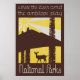 Fully restored and digitally enhanced travel poster showing the silhouette of a deer in a mountainous landscape. Colours corrected. Imperfections removed.