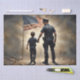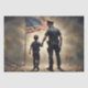 A decorative tissue paper design intended for decoupage, featuring a heartwarming tribute to American law enforcement. At the centre, a police officer in uniform tenderly holds the hand of a young child, symbolising protection and guidance. In the background, a prominently displayed American flag waves gently, emphasizing patriotism. The composition is rendered in a painterly style with soft, warm colours and subtle detailing, making it ideal for crafting and honouring those who serve and protect.