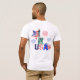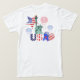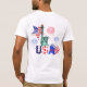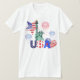 “USA” with the Statue of Liberty behind it and a heart and star in American flag style, and fireworks in red, white, and blue. A great gift for the 4th of July.