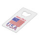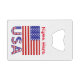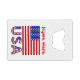 Personalised credit card bottle opener features the flag of the United States of America with the letters USA below in the red, white and blue with stars and stripes, found in the flag. Personalise by adding a name for yourself or a creative gift. Great for Independence Day or other patriotic holidays. Cool to use at family reunions, travel groups, and clubs. Terrific stocking stuffer gift.