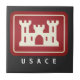 Darkened version of the U.S. Army Corp of Engineers scarlet and white castle logo on black background with white text