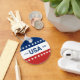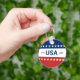 Celebrating the USA's 250th anniversary. This red, white, and blue button has the word 'USA' in the center. The years 1776 and 2026 are next to USA. The top stripe is blue and has white stars. The center stripe is white. The bottom stripe is red with white stars.