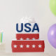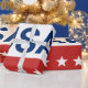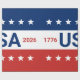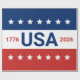 Celebrating the USA's 250th anniversary. This red, white, and blue wrapping paper has the word 'USA' in the centre. The years 1776 and 2026 are next to USA. The top stripe is blue and has white stars. The centre stripe is white. The bottom stripe is red with white stars.