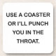 USE A COASTER OR I'LL PUNCH YOU IN THE THROAT. COASTER HUMOR. HILARIOUS DRINK COASTER. DON'T DAMAGE MY TABLE TOP! PROTECT YOUR COFFEE TABLE WITH THIS DRINK COASTER. HILARIOUS COASTER SAYINGS. USE A COASTER OR I'LL PUNCH YOU. PERFECT GIFT FOR THE FURNITURE OBSESSED FRIEND. DRINK RINGS MARKS. SWEATY DRINKS. NEW HOME GIFT. CONGRATULATIONS ON YOUR NEW HOME FUNNY GIFT.