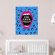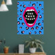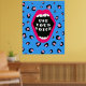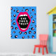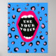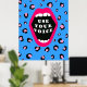 Use your voice! Speak up, even if your voice shakes. Leopard print background in blue and pink showcases a vibrant pink shouting mouth.