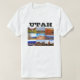 Nine landscape icons in Utah are featured on the front of the shirt, with Utah in bold letters. On the back is Mesa Arch at sunrise in Canyonlands National Park.