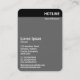 A vertical business card template with a black header with an image on the front. Company name in the header on the front and back with All other contact details on the back. The photo or image on the front can also be changed. The design also allows plenty of scope for additional customisation.