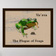 A slightly humourous illustration for Torah portion Va'era in which the first two plagues occur - Nile water is turned to water after which Egypt is overrun frogs. Features the image of a frog with human legs, Pharaoh's, dangling from its mouth and the striped blue and gold headdress which Paroh (Pharaoh) is generally depicted as wearing, discarded on the ground. The image is superimposed on a background resembling the wall of desert ruins. The Egyptian goddess of fertility and childbirth Heket was depicted as a frog or a woman with the head of a frog. On temple walls she was typically in anthropomorphic form, while on amulets Heket was usually in animal form. The frog was an appropriate symbol of fertility as frogs and toads were very common in the Nile delta region. As a plague frogs could thus be seen as foreshadowing the later destruction of Egyptian firstborns.