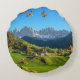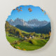 round throw pillow with the village of St. Magdalena or Santa Maddalena with the characteristic church in front of the Geisler or Odle Dolomites mountain peaks in the Val di Funes valley (Villnoesstal) in Italy in autumn surrounded by autumn leaves.