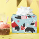 Cute Valentine's Day Border Collies wearing red, pink, and white polka dot and heart sweaters with scattered paw prints and arrow on a blue background.