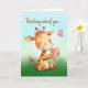 This charming Valentine’s Day card features a delightful watercolor illustration of a young giraffe sitting happily, holding a heart with its front paws. A simple butterfly flutters nearby, adding a whimsical touch to the design. Soft green grass and a light blue sky create a serene backdrop. The front reads, "Thinking of you ..." while the inside finishes with: "... makes my heart smile. Sending warm wishes and love on Valentine’s Day!" Perfect for sharing heartfelt affection with someone special, whether a friend, family member, or sweetheart.