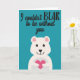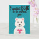 This cute Valentine's greeting card features a lovely cartoon white bear holding a pink heart on a light blue background with a fun word pun caption that reads "I couldn't BEAR to be without you".