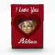 Valentine heart shih tzu love Custom photo name gift. Shihtzu with text I love you on dark red. Personalise with your name and photo. Valentines dog lovers gifting idea. Beautiful adorable cuddly dog lying on the floor. Brown and white puppy with long hair, big round dreamy eyes and black nose.