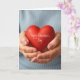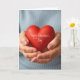 An elderly woman wearing a soft blue sweater gently holds a red heart in her hands.