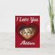 Valentine heart shih tzu love Custom photo name Card. Shihtzu with text I love you dark red card. Personalise with your name and photo. Valentines dog lovers card idea. Beautiful adorable cuddly dog lying on the floor. Brown and white puppy with long hair, big round dreamy eyes and black nose.