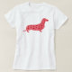 Dachshund silhouette filled with tiny red hearts on a pink background and outlined in white. This t-shirt is a great Valentine's Day gift for that someone who loves this hound dog breed.