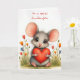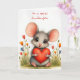 A cute mouse with large, expressive eyes holds a bright red heart in a field of colourful flowers.
