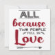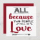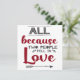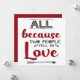 This lovely greeting card is perfect for Valentine's Day, birthdays or anniversaries, and it features the caption "All because two people fell in love", written in red and dark grey modern fonts on a white background, and decorated with tiny hearts and a grey arrow.