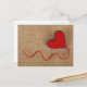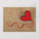 Valentine' s Day Postcard with one handmade stitched toy red heart and red twine on canvas background