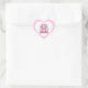 Heart sticker is shown in a pink and white polka dots print with a cute Valentines teddy hug me print.