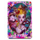 Whimsical vibrant and artistic painting with colourful confetti..Mythical love between Harlequin and Columbine,Acrylic painting inspired from Venetian feather masks and Commedia dell'arte - Venice. Bright purple pink yellow green colours.