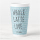 Celebrate love and friendhip with this Valentine's day latte mug, featuring the text 'Whole Latte Love' in black script on a pastel blue background adorned with a pretty little hearts pattern. Personalise this heartfelt gift with your name! Exclusively designed for you by Happy Dolphin Studio.
