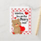 Have a Beary sweet Valentines with this adorable teddy bear greeting card. Features a teddy bear hiding a heart with a fun red doodle heart background. Message inside can be personalized.