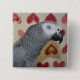 African Grey Parrot on your Square Button Pin for Valentine's Day. Red and Pink hearts background.