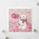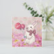 A cute illustration of a bunny with balloons on pink flowers