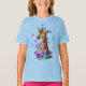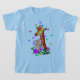 This adorable giraffe is surrounded by multicolored hearts, flowers, and a flirty expression that is perfect for Valentine's Day t-shirts, or a romantic gift, and especially for children's clothing.