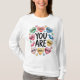 This uplifting Valentine design surrounds gentle heart illustrations with powerful affirmations like strong, loved, brave, and worthy. Soft colors and positive words create a meaningful reminder of self-love, confidence, and inner strength for everyday wear.
