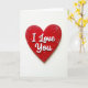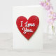 This greeting card shows a single red heart centered on a soft cream background, so your eyes go straight to it. The heart looks slightly worn in a sweet way, with tiny white specks and light scuffs across the surface. On the heart, raised white text reads “I Love You,” standing out clearly against the red. The words are arranged in three parts, with “I” and “You” in simple print and “Love” in a flowing cursive style. Small pearl-like white dots are scattered around the heart, adding a gentle, festive touch. The lighting is soft and even, with almost no shadows, which keeps the mood calm and sincere ❤️.
