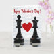 This Valentine's Day card shows two black chess pieces, a king on the left with a cross on top and a queen on the right with a crown-like top. Between them floats a bright red heart, centered like the focus of the whole scene ❤️. The pieces look calm and steady, facing forward as if they’re standing together. A black-and-white chessboard sits along the bottom, with a slight shine that reflects the bases of the pieces. At the top, the words “Happy Valentine’s Day!” appear in red script lettering, easy to spot against the lighter background 💌. The background has a soft pattern and gentle lighting that makes the heart and the glossy pieces stand out. Overall, it feels like a sweet message about love and partnership, even in a game of strategy
