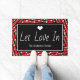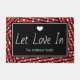 Modern trendy doormat featuring a stripes and white dots design in red, black, and white. The centre has the words "Let Love In". Give your doorstep a February valentine's day makeover!