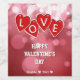 Romantic illustration featuring hanging red hearts with "LOVE" letters on a bokeh background.