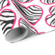 This wrapping paper features a unique and delightful design that combines the distinctive zebra stripes with the timeless appeal of black and white hearts, all framed by a delicate pink outline. The result is a striking yet charming pattern that seamlessly blends zebra patterns with heart motifs.