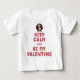 Valentines day shirts for toddlers with red typography text Keep Calm and Be My Valentine and Valentine penguin printed on white background. It's long sleeves shirt for toddlers, made of 100% combed cotton. It's available in four sizes, from 2T to 5/6 T and in eight colours.