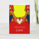 Valentine's Day, With All of My Love, XOXO Heart, paper greeting card. Illustration of a woman wearing a colourful dress decorated with hearts and flowers and holding on to a white heart with XOXO written on it. With all of my Love written in white text on the cover. The woman has a darker skin tone. A lighter skin tone version of this card is available. Art, image, and verse copyright © Shoaff Ballanger Studios.