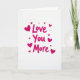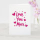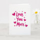 This greeting card keeps things simple and sweet, with the message “Love You More” as the main focus. The words are hand-drawn in bright fuchsia and sit centered on a plain white background. The lettering has rounded edges and a slightly uneven, personal look, like it was written with real care. Around the message, several fuchsia hearts are scattered across the card in different sizes, from tiny accents to larger heart shapes. The hearts feel like they’re floating around the words, adding extra warmth and affection ❤️. There isn’t any background scene or extra objects—just the message and hearts—so your eyes go right to the sentiment 💌. It’s a great pick for a partner, close friend, or anyone you want to remind that you care 🍫.