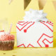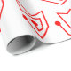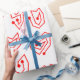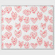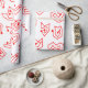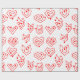 This wrapping paper has a mid-century modern Valentine’s design of scattered red heart mazes on a field of white.