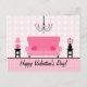 A Valentine's postcard featuring an illustration of a pink living room complete with a pink sofa with heart shaped throw pillows, a heart chandelier, and end tables with a vase of pink flowers and a heart shaped lamp. Polka dot background. Text at bottom reads "Happy Valentine's Day!"