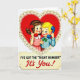 This greeting card shows a sweet mid-century style drawing of a boy and girl inside a large red heart. The girl has brown curly hair, rosy cheeks, and a pink dress, and she holds a red rotary phone receiver to her ear with a gentle, hopeful look. Next to her, a blond boy in a light blue shirt and a green bow tie holds a blue phone receiver and smiles with wide blue eyes. The heart has a cream and white stitched border that looks like lace, making the scene feel extra loving. The colors are bright and simple, with reds, pinks, blues, and touches of yellow that keep the focus on the couple and their call ❤️💌. Near the bottom, a cream banner reads “I’VE GOT THE ‘RIGHT NUMBER’” in black block letters, and just below it “It’s You!” appears in red script 🍫. It’s a cute, friendly way to say you’re thinking of someone special, so go ahead and share your Valentine’s Day feelings with someone you care about.