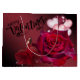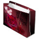 degraded cherry background and festive-red-clad woman surrounded by red rose leaves and a large rose with balloons in the shape of pink hearts.