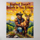 This heartwarming artwork captures a Bigfoot, a true "Valley Guardian," wearing a cowboy hat and overalls, sitting on a rock and gently embracing a small deer. The scene is set in a picturesque valley with a colourful sunset and rolling hills. The iconic sign with the memorable words "BIGFOOT DOESN'T BELIEVE IN YOU EITHER" is prominently displayed. The painting's thick, textured strokes add to the endearing and whimsical quality of the image.