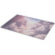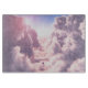 A solitary hot-air balloon floats through the pale pink canyon between towering clouds. The sun, low in the pastel sky, glows behind the edge of the billows, sending streams of bright light towards the viewer.