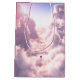 A solitary hot-air balloon floats through the pale pink canyon between towering clouds. The sun, low in the pastel sky, glows behind the edge of the billows, sending streams of bright light towards the viewer.